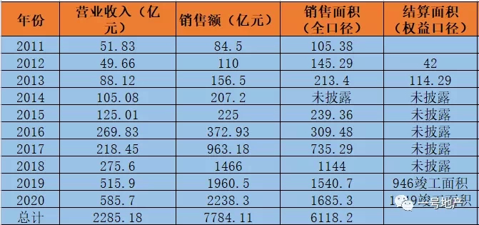 由于中南建设的年报中,包含了建筑业和房地产开发两大主营业务,一号君从年报中仅摘录房地产开发业务的相关数据进行纵向和横向比对,主要摘录了2011年至2020年的销售、营收和新增土储、总土储等数据。