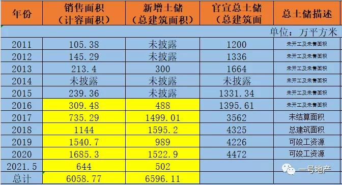 一号君发现,从2016年至2021年5月,中南建设累计6058.77万平方米(计容面积),累计新增土储6596.11万平方米(总建筑面积),期间差值仅500万平方米。
