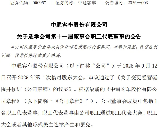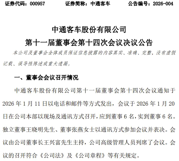 2026年1月22日,中通客车股份有限公司发布第十一届董事会第十四次会议决议公告和关于选举公司十一届董事会职工代表董事的公告。1月20日,中通客车召开第十一届董事会第十四次会议审议通过多项议案,其中包括关于推选何伟为公司第十一届董事会非独立董事的议案和关于推选田景东为公司第十一届董事会非独立董事的议案。