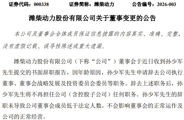 2026年1月13日,潍柴动力股份有限公司发布关于董事变更的公告。公告显示,潍柴动力近日收到孙少军提交的书面辞职报告,因年龄原因,孙少军申请辞去公司执行董事、董事会战略发展及投资委员会委员等职务。辞去上述职务后,孙少军将不再担任公司(含控股子公司)任何职务。孙少军的辞职未导致公司董事会成员低于法定人数,不会影响董事会的正常运作及公司的正常经营。