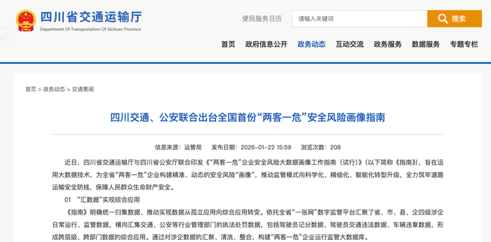 2026年1月下旬,四川省交通运输厅与四川省公安厅联合印发《“两客一危”企业安全风险大数据画像工作指南(试行)》,通过对涉企数据的汇聚、清洗、整合,建立“两客一危”企业运行监管大数据库,为全省“两客一危”企业构建精准、动态的安全风险“画像”,推动监管模式向科学化、精细化、智能化转型升级。通过构建一套科学、统一的数据指标体系,四川将对企业的安全状况进行量化评估与动态评分,实现安全风险科学量化。