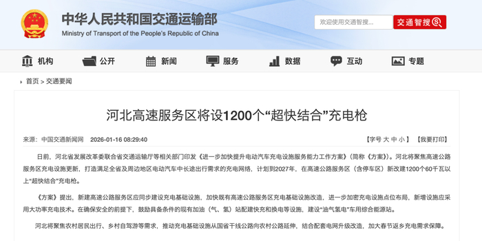 2026年1月中旬,河北省发展改革委、河北省交通运输厅等部门联合印发《进一步加快提升电动汽车充电设施服务能力工作方案》。河北将聚焦高速公路服务区充电设施更新,打造满足全省及周边地区电动汽车中长途出行需求的充电网络,计划到2027年,在高速公路服务区(含停车区)新改建1200个60千瓦以上“超快结合”充电枪;在确保安全的前提下,鼓励具备条件的现有加油(气、氢)站配建快充和换电等设施,建设“油气氢电”车用综合能源站。