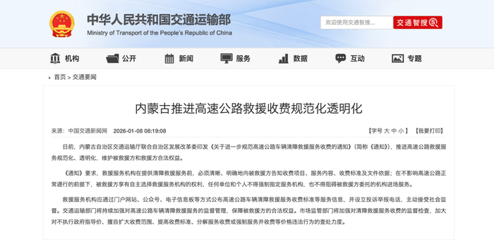 2026年1月上旬,内蒙古自治区交通运输厅联合自治区发展改革委印发《关于进一步规范高速公路车辆清障救援服务收费的通知》,推进高速公路救援服务规范化、透明化,维护被救援方和救援方合法权益。《通知》要求,救援服务机构在提供清障救援服务前,必须清晰、明确地向被救援方告知收费项目、服务内容、收费标准及文件依据;在不影响高速公路正常通行的前提下,被救援方享有自主选择救援服务机构的权利,任何单位和个人不得强制指定服务机构,也不得阻碍被救援方委托的机构进场服务。