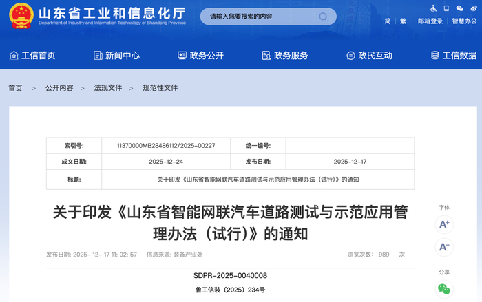 2025年12月17日,山东省交通运输厅、山东省工业和信息化厅、山东省公安厅联合印发《山东省智能网联汽车道路测试与示范应用管理办法(试行)》,规范智能网联汽车道路测试与示范,支持智能网联汽车企业开展规模化测试运行和商业化应用。《办法》明确示范运营阶段,车辆以自动驾驶模式进行合计不少于240小时或不少于1000公里的示范应用,且示范运营主体在全国范围内累计开展不少于10万公里的示范应用或道路测试,或已在山东省开展总里程不少于5万公里的示范应用或道路测试,可申请在测试道路开展载人载货或者特定场景作业的市场化收费行为。