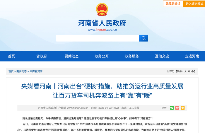 2026年1月下旬,河南省交通运输厅发布《河南省提升12328热线投诉处置质效服务货车司机二十一条硬措施》,针对货运平台收费不透明、投诉处置慢等痛点,建立多维度评价体系,紧盯平台公开承诺的降费措施及《网络货运信息交易撮合平台保障货车司机合法权益自律公约》落实情况,分区域、分时段开展动态监测;对司机反映强烈的重点案件线索,实行提级督办、从严查处。