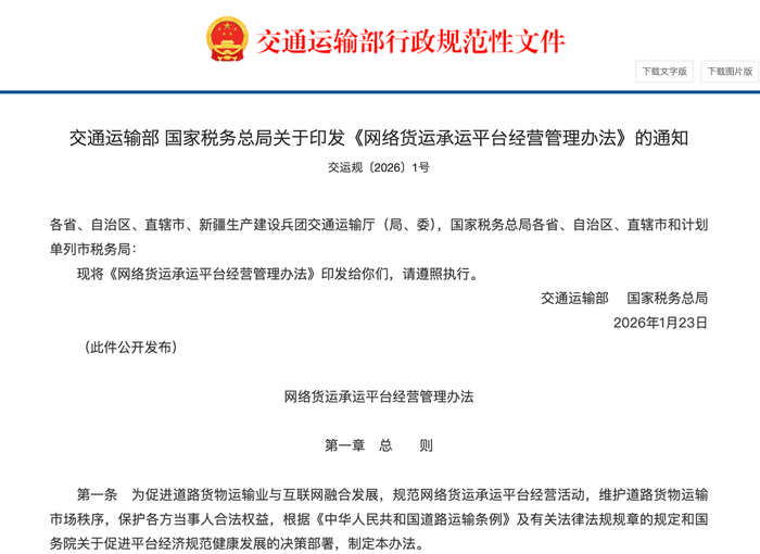 2026年1月下旬,交通运输部、国家税务总局联合印发《网络货运承运平台经营管理办法》,自印发之日起实施。《办法》在经营管理方面提出了多项具体要求,包含平台需申领《道路运输经营许可证》并具备相应的线上服务能力、必须建立健全安全生产管理制度、需对实际承运车辆及驾驶员资质进行严格审查、确保线上线下提供服务的主体一致、不得委托超越实际承运人经营范围的业务、不得虚构运输交易、不得指使或强令超载超限运输、需按要求将运输单证信息上传至省级网络货运信息监测系统、应合理制定交易规则和服务协议、建立服务评价与投诉举报机制等。