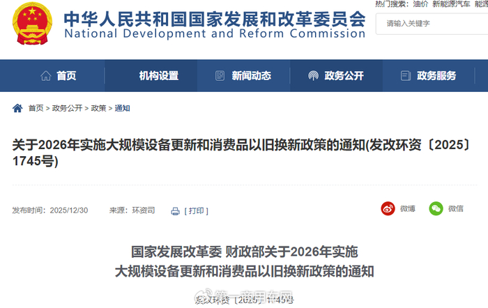 2025年12月30日,国家发展改革委、财政部发布关于2026年实施大规模设备更新和消费品以旧换新政策的通知,明确2026年推进大规模设备更新,支持老旧营运货车报废更新,继续支持报废国四及以下排放标准营运货车更新为低排放货车,优先支持更新为电动货车,补贴标准按照《关于实施老旧营运货车报废更新的通知》(交规划发〔2025〕17号)执行。