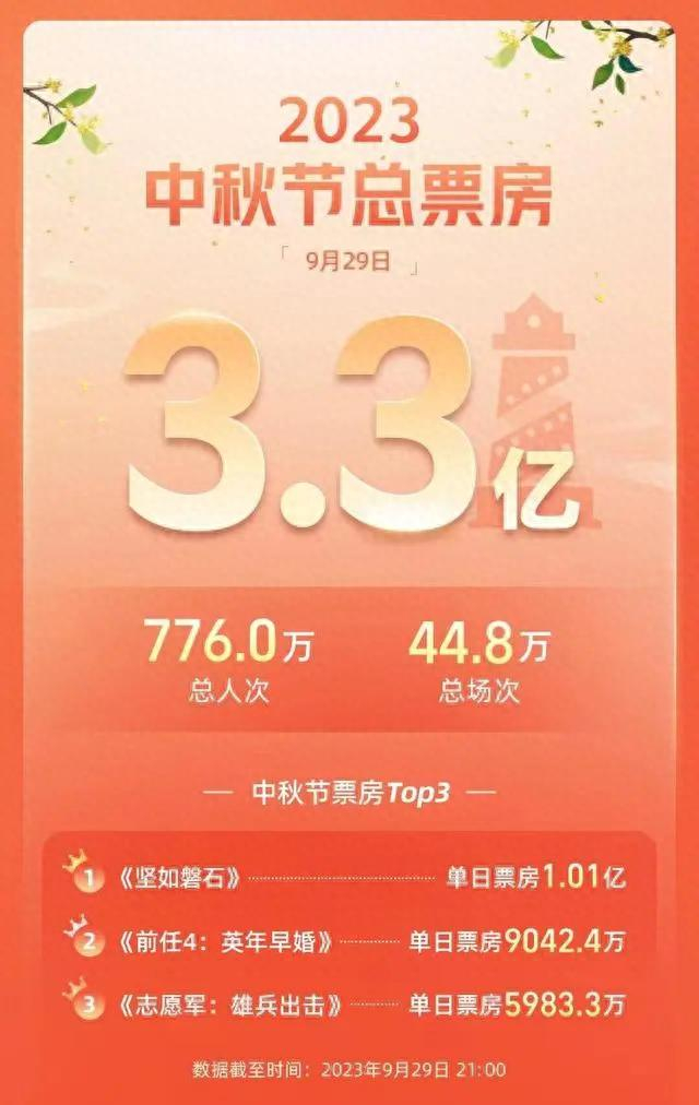 难怪它一上映,就呈现出了“领跑”2023年国庆档的趋势。单是中秋节这天,单日票房就收获1.01亿以上,成为票房冠军。有网友预测,《坚如磐石》最终票房很可能会突破22亿元。