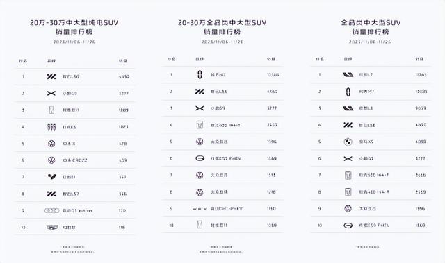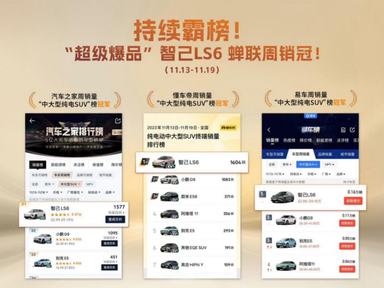 智己LS6在最新发布的近三周榜单中再次成为销冠,取得了销量冠军的佳绩。来看看数据,在20-30万中大型纯电SUV的销量排行榜上,智己LS6再一次以4450辆的成绩夺冠,这可真是让人惊喜啊!真的是周周霸榜,连连销冠啊。而且,即使将前面的定语换成全品类,智己LS6都能排到亚军,这实力真是太强了!这意味着啥,就是放眼整个车圈,不论燃油还是新能源,LS6竞争力都是数一数二的,可谓是现象级的大爆品。而在所有中大型SUV里,智己LS6也已经跻身前四,成为首台超越X5的纯电SUV,标志了中国汽车在纯电领域的真正崛起!