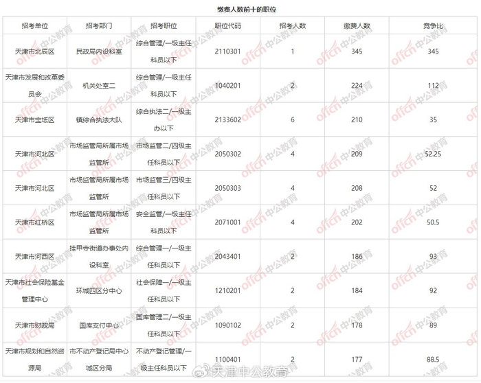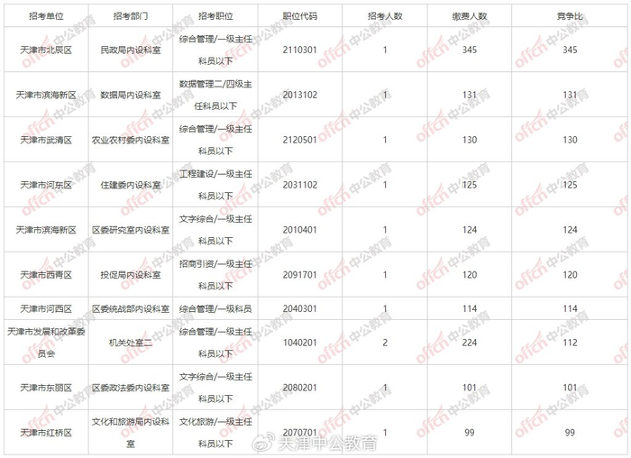 截至11月11日14时,竞争比例较高的职位为天津市北辰区-民政局内设科室-综合管理/一级主任科员以下一职,招录1人,截止到11月11日14时缴费人数为345人。