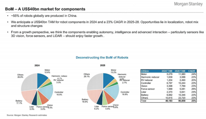 机器人物料清单(BoM)——电机和电池占比最大,传感器和视觉系统增长最快:大摩认为全球55%的机器人在中国生产,2024年机器人零部件总可用市场(TAM)为400亿美元;我们预测到2028年的复合年增长率为23%。