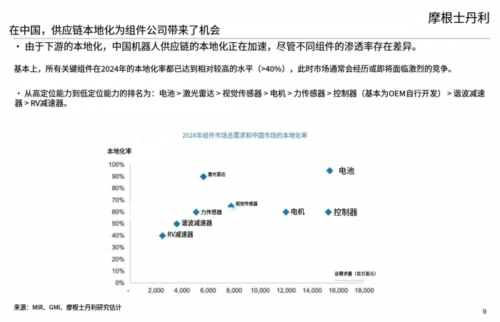 大摩预计到2028年,电机和电池将是最大的TAM类别,分别占总物料清单(BoM)的13%和17%,传感器和视觉系统具有最强的增长潜力。