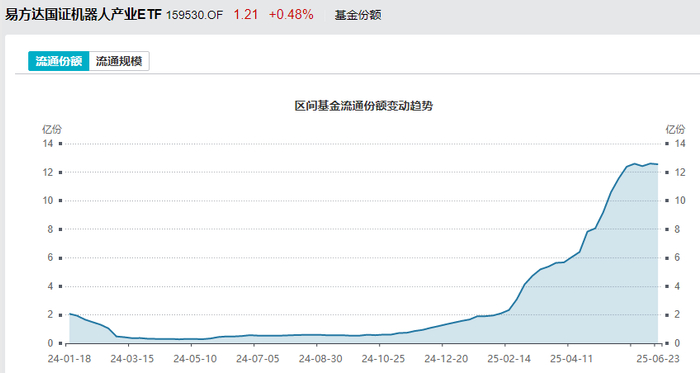 机器人ETF易方达(159530)的基金份额从去年的1亿份暴增至12亿份,看好机器人长线逻辑的聪明资金在近两个月的回调中不断增加配置。