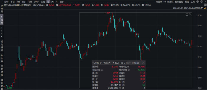 原因是昨天特斯拉的robotaxi在北美上线测试,昨夜特斯拉暴涨10%,有了robotaxi不再跳票的积极信号,市场资金开始提前布局特斯拉机器人的核心供应链,因此今天机器人ETF易方达(159530)大涨4.64%,而这只ETF年内涨幅仅为8%,仍处于年内相对较低的位置。