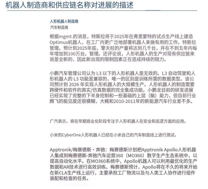 从下图中看,根据高盛的跟踪,特斯拉optimus机器人预计到2025年的产量达到几千台,在未来不到五年内增长到100万台。而小鹏、广汽、小米、奔驰、优必选等企业都在布局人形机器人。