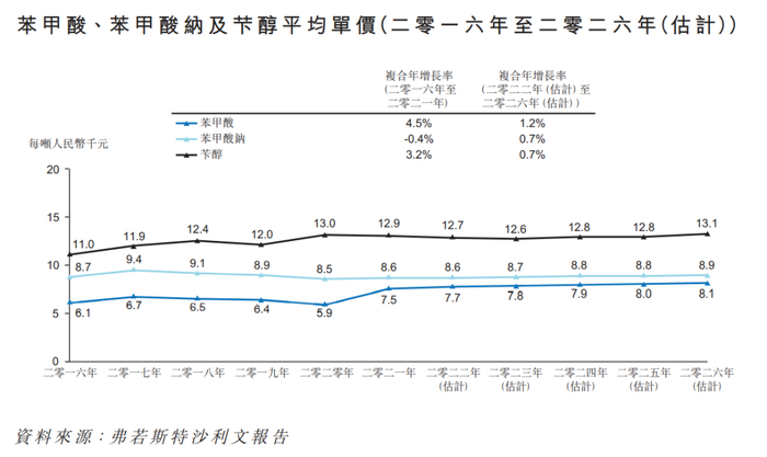 原材料成本市场。苯甲酸的平均单价由2016年的每吨6.1千元增至2021年的每吨7.5千元,复合年增长率为4.5%。苯甲酸钠及苄醇的价格于2016年至2021年表现出相对稳定的趋势,2021分别达至每吨8.6千元及每吨12.9千元,并预计保持缓增趋势,到2026年分别达至每吨8.9千元及每吨13.1千元。