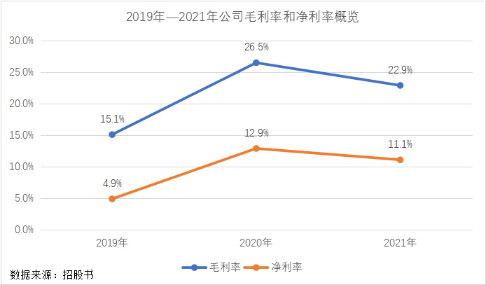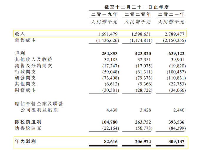 2019年至2021年,公司实现营收16.9亿元、16.0亿元及27.9亿元,年复合增长率为28.42%。相应年度纯利由0.8亿元增加至2.1亿元,并进一步增至3.1亿元,年复合增长率为93.44%。