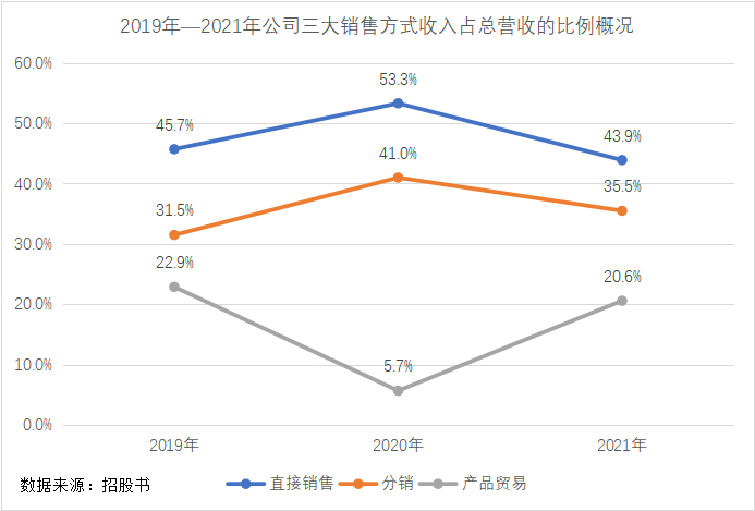 公司的收入主要来自自制产品的销售。据招股书,2019年至2021年,公司自制产品销售收入分别占总收入约77.1%、94.3%及79.4%。