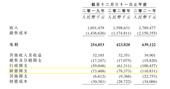 公司不断加大研发投入,2019年至2021年,公司的研发开支分别为73.4百万元、79.4百万元及110.8百万元,研发费率分别为4.3%、5.0%以及4.0%。