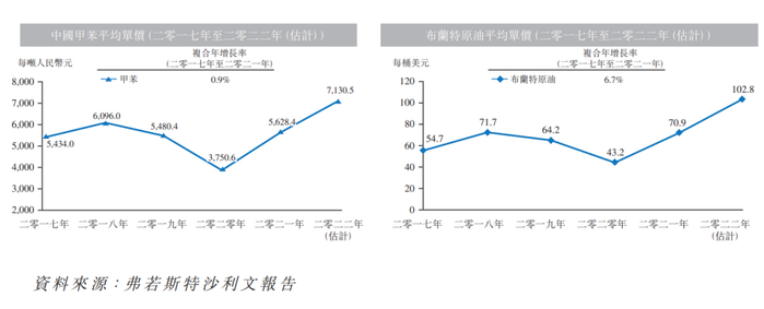 整体而言,国际原油价格与甲苯平均单价呈正相关,石油是不可或缺的原材料之一。于2020年,由于石油消费下滑、成品油库存积压及调合油需求萎缩,甲苯平均单价下降31.6%。随着油价持续上涨,甲苯价格亦出现类似走势,预计于2022年将达至每吨7130.5元。