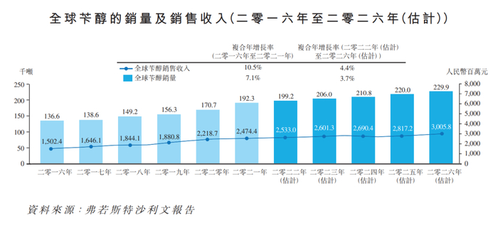 由于全球经济复苏及苄醇在制药、消费电子、添加剂材料及家居装修行业的应用及使用不断增加,据沙利文预计,全球苄醇销量将由2022年的19.92万吨增至2026年的22.99万吨,复合年增长率为3.7%,销售收入将由2022年的25.3亿元增至2026年的30.1亿元,复合年增长率为4.4%。中国苄醇销量预计将由2022年的10.74万吨增至2026年的13.20万吨,复合年增长率为5.3%,销售收入估计2026年达至18.6亿元。
