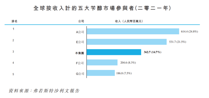据沙利文报告,2021年,全球苄醇的市场规模达约24.7亿元。按市场收入计,全球五大苄醇制造商的集中度由2020年的74.9%增加至2021年的76.8%。按2021年的收入计,武汉有机在苄醇制造商中排名第三,占全球市场收入的14.7%。按销售收入计,武汉有机是中国第二大苄醇制造商。