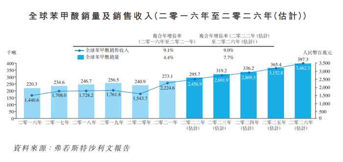 据沙利文预计,苯甲酸的全球销量将由2022年的29.57万吨增至2026年的39.73万吨,复合年增长率为7.7%。全球销售收入将由2022年的24.6亿元增至2026年的34.6亿元,复合年增长率为9.0%。中国甲苯酸销量预计于2026年达至20.82万吨,自2022年起,复合年增长率为8.2%,而销售收入预计将由2022年的14.0亿元增至2026年的20.2亿元,复合年增长率为8.2%。