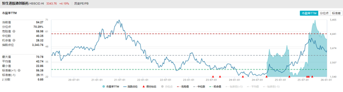 从下图中看,恒生港股通创新药的分位数在70%,目前的静态估值相较2025年9月份时便宜了不少,指数的静态估值情况也没有达到21年的顶峰水平。