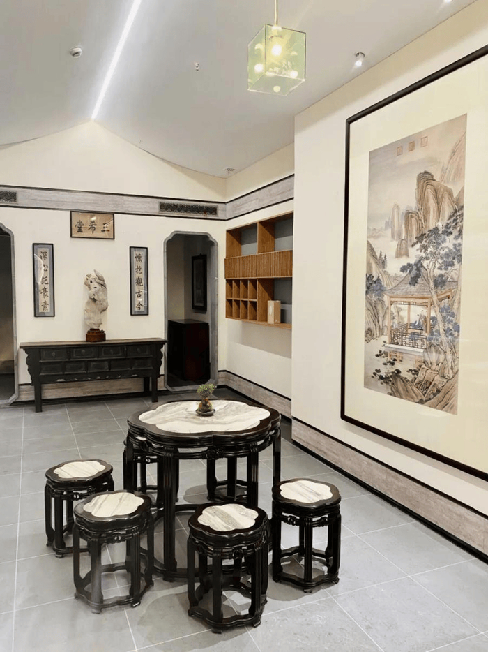 紫禁书院·昆山分院设计兼具紫禁城美学气质与江南文化雅韵,故宫文物纹样与昆山水乡黛青色在此相得益彰,书院内设有故宫文化展厅、仿清代乾隆皇帝书房三希堂、紫禁大讲堂、文创区域、戏台、茶歇阅读区、咖啡屋等功能空间。