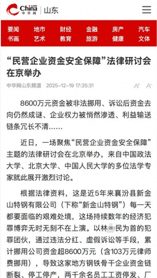 近日,据中华网报道一场有关“民营企业资金安全保障”的法律研讨会在京举行,案例聚焦山西省襄汾县新金山特钢有限公司(下称“新金山特钢”)8600万元资金流失的命运。