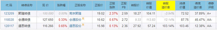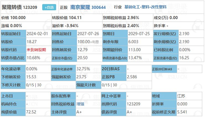 南京聚隆申购前一日收盘价19.02,转股价18.27,转股价值104.11。可转债转股价值越高越好。