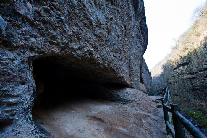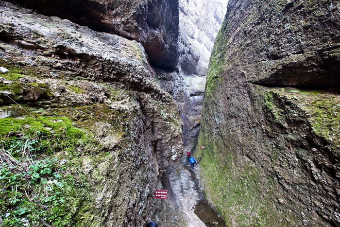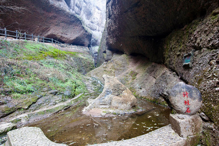 过藏宝阁就进入“二道闸”,它比起“一道闸”更加窄长、更加险峻。这里更加阴暗,只有到中午时分,这个谷底才能见到一缕阳光,故称为“一线天”。崖壁的上方有一条数米宽的水道,常年水滴不断,它是瀑布留下的痕迹,每当雨后,瀑布从天而降,让人震撼。抬头上看,只能看到很少的一点天空,因此此处也称为“窥天崖”。