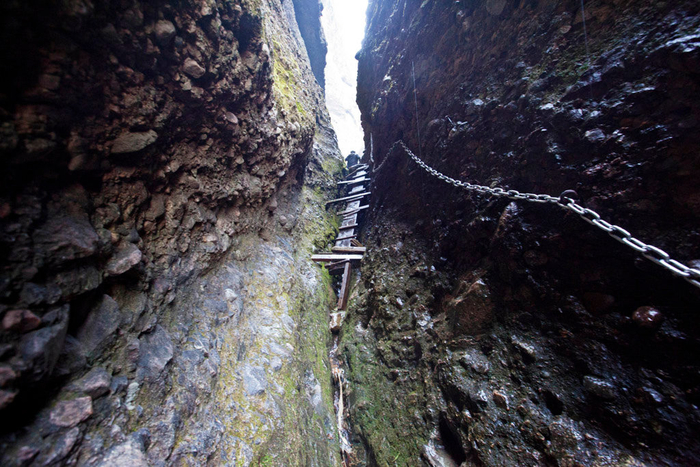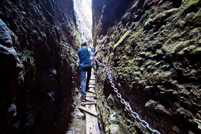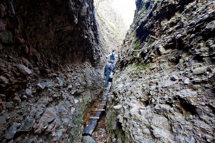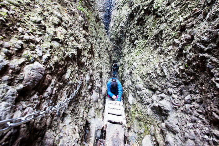 再往前就是“三道闸”,这是一处上下约有三层楼高的崖壁,几乎无落脚之处,只能手脚并用,循着人工开凿的石凹艰难往上攀爬,惊险刺激。穿过小水潭,能看到在悬崖峭壁之间隐约有一条缝隙,其名“地缝”。