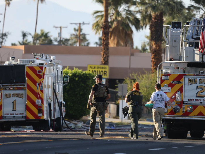 5月17日,在美国加利福尼亚州棕榈泉市,调查人员在爆炸事件现场附近工作。新华社发