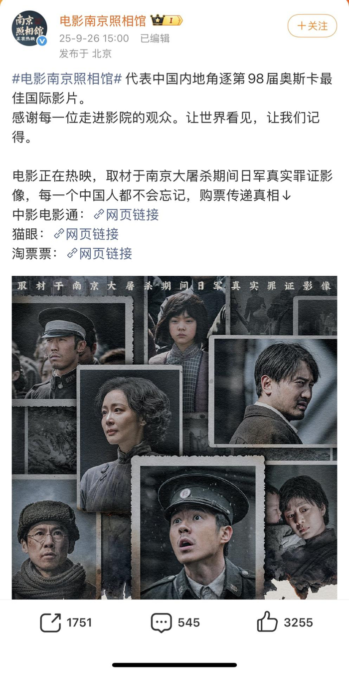9月26日,正在热映的《南京照相馆》官方微博发布消息,影片将代表中国内地角逐第98届奥斯卡最佳国际影片。目前,该片累计票房已破30亿元,登顶今年暑期档票房冠军。