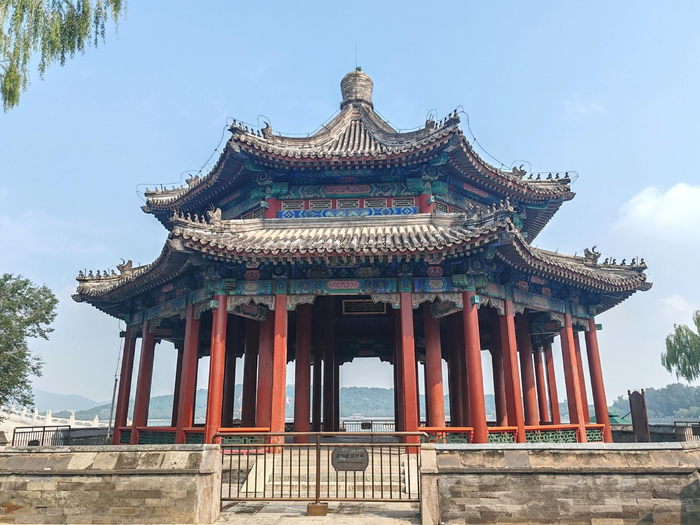 八方亭位于颐和园新建宫门以南东堤上,本称廓如亭,意为开朗空阔,虚明洞彻之亭。建筑形态舒展稳重,气势雄浑,与十七孔桥、南湖岛在空间上互相映衬。八方亭始建于乾隆十七年(1752年),其坐北朝南,平面呈八方形,每面显三间,周围有廊,重檐八脊攒尖圆宝顶,亭中共有40根柱子。八方本指东、西、南、北、东南、西南、西北、东北八个方向,而在传统建筑中八个角常与八卦方位相关联,分别对应八卦中的乾、坤、震、巽、坎、离、艮、兑,代表天、地、风、雷、水、火、山、泽八种自然现象。这种形制在风水学中常被赋予“藏风聚气”的功能,通过八角攒尖顶的设计汇聚天地之气,象征着八方来仪。