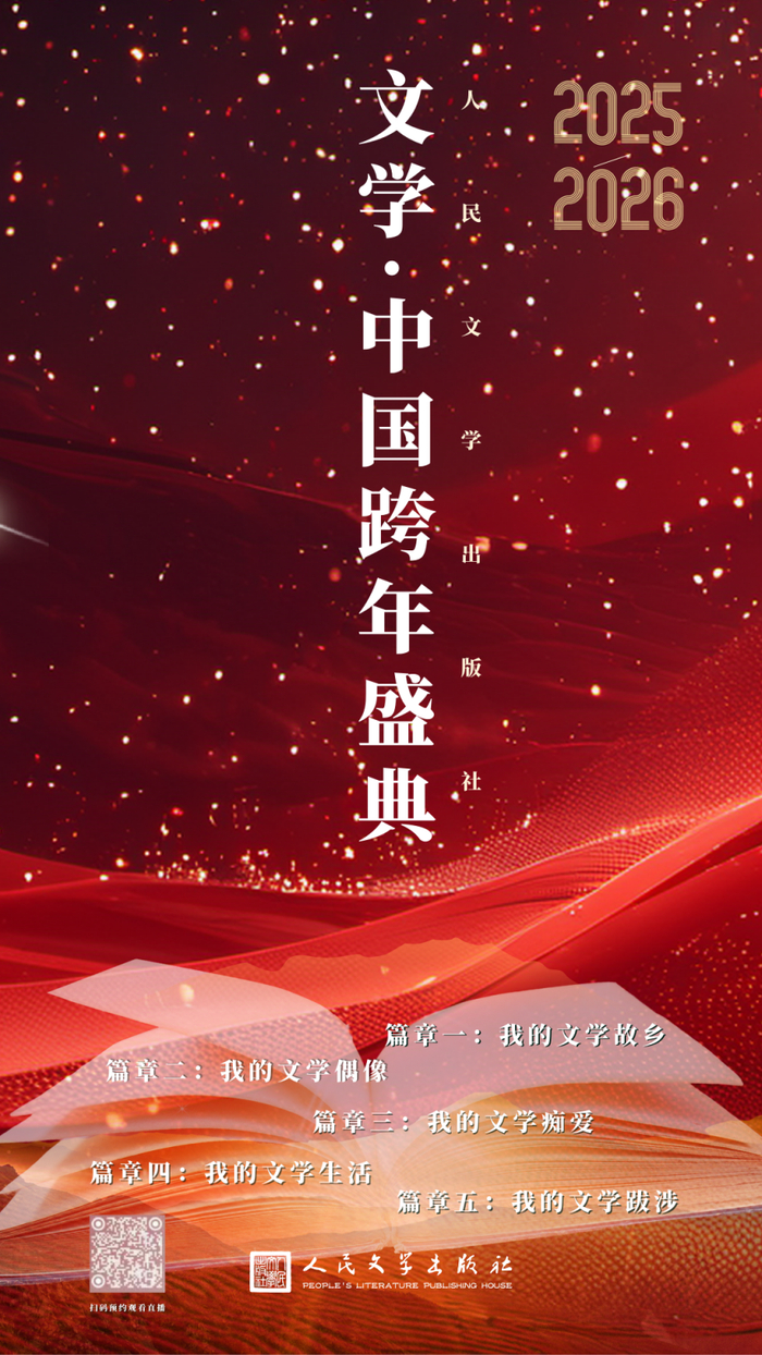 又是一年辞旧迎新时。当城市渐次亮起节日的灯火,总有一束光,来自文学的深处,来自我们共同仰望的精神星空。 12月31日19:30至00:15,由人民文学出版社主办的2026“文学·中国”跨年盛典,将于中国国际出版交流中心B1层光华堂隆重举行,20位文学名家与文化名人将齐聚一堂,以五大篇章串联起一场跨越时空的文学之旅。北京日报客户端、北京日报艺绽视频号将进行全程直播。