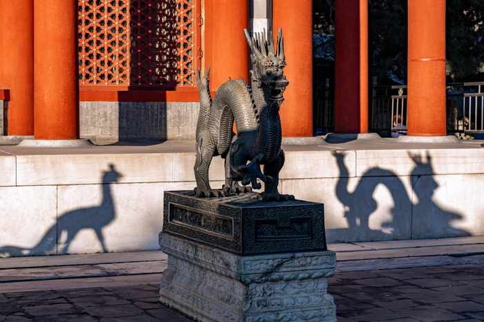 “由于太阳高度在不断变化,机位也得跟着微调,最好提前一天来踩点,确定大致位置,第二天一早再来拍摄,不然很容易错过最佳角度。”马涛说,斜对着铜龙的机位和斜对着铜缸的机位,都可以拍到龙凤同框的对称感。“拍摄时,三脚架的高度要略低于栏杆,这样可以让龙凤的影子显得高大挺拔,气场更足。”