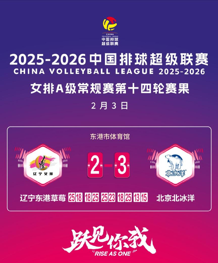 2月3日,中国排球超级联赛女子A级常规赛展开最后一轮争夺,北京北冰洋女排客场苦战五局逆转辽宁女排,用一场胜利为本阶段收官。