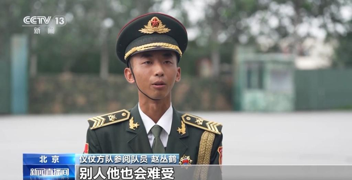 仪仗方队参阅队员 赵丛鹤:可以说是基准兵里面的基准兵。当时很多人都不看好我,因为在外人看来需要身形壮硕一点,我比较偏瘦,身形壮硕一点他更能稳住方队的节奏。但是我就不信,别人说稳不住节奏,我就使劲,我再使劲,我使的劲比别人多很多,我让别人都能听见我的步音。