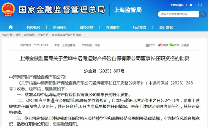近日,上海金融监管局发布任职资格批复显示,核准孟晔中远海运财产保险自保有限公司董事长的任职资格。