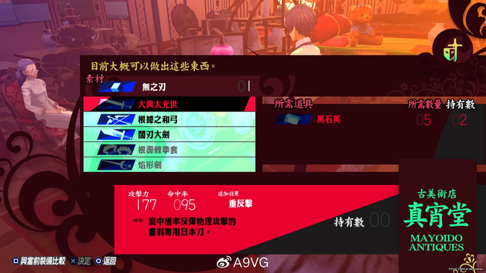 系列关键系统Persona合成也更“现代化”,在获得前述的大阿尔卡那增益后,Persona的强化与育成能更快捷舒适地进行。不过有一点,古董美术店“真宵堂”在围绕Persona的功能上做了调整,《P3R》中删除了利用Persona来进行武器合体(无印、也就是初版P3中也没有,在FES才追加),改为使用材料来打造武器装备,提升了探索与战斗时入手宝石等物品的重要性。