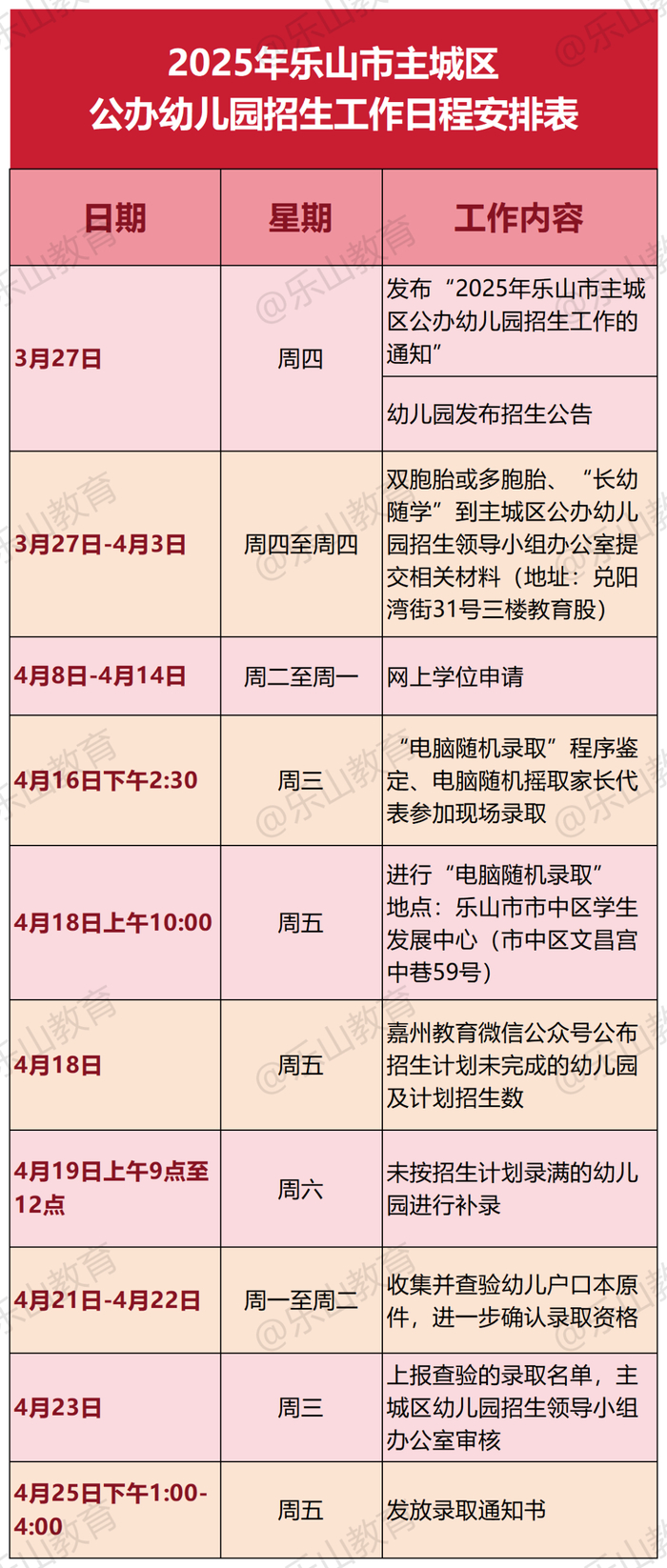 依据乐山市主城区各公办幼儿园学位申请实际状况确定录取方式。