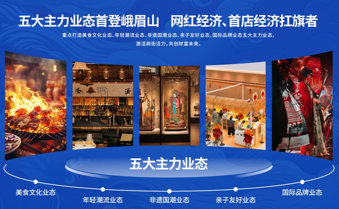 据了解,“峨眉山前”以“一张名片、一个样板、一个目的地”为发展使命,致力于打造“峨眉游娱首站,国潮文化街区”,通过4大主题街区、5大主力业态及沉浸式演艺等创新要素,构建集沉浸式游娱、非遗文创、休闲娱乐、研学体验、夜间经济等于一体的综合性文旅目的地。