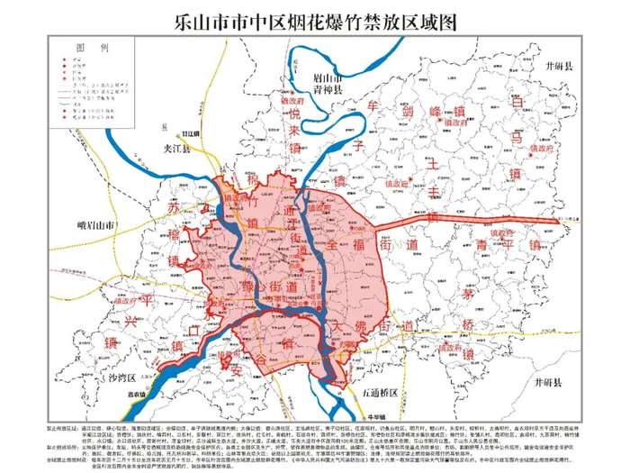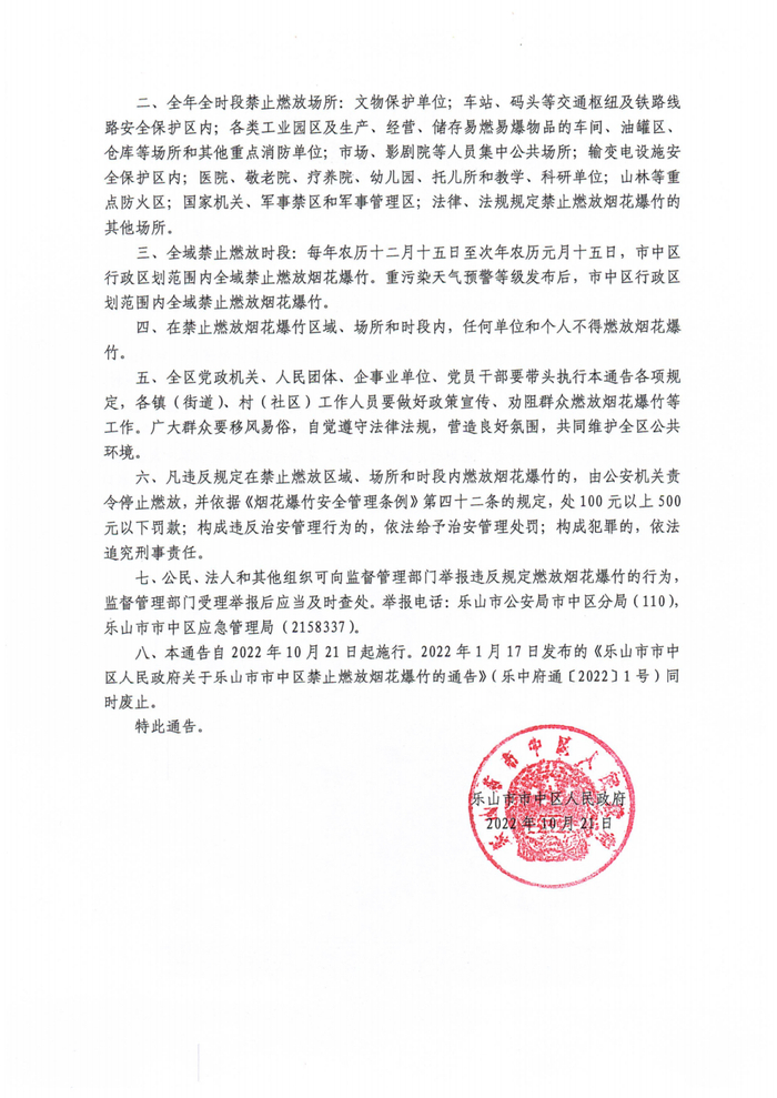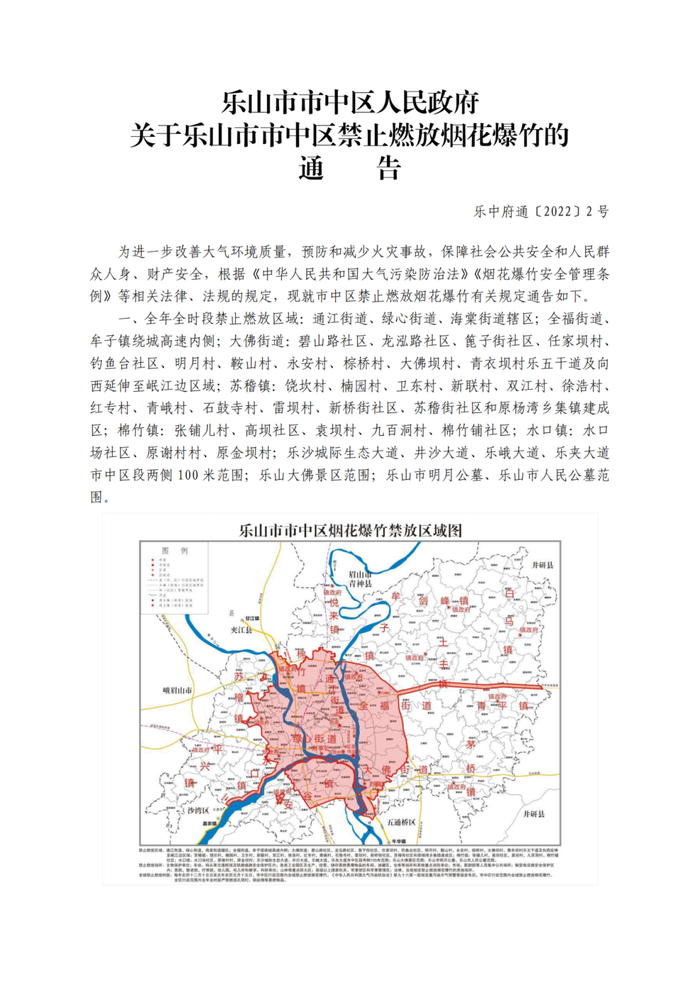 一、在乐山市市中区通江街道、绿心街道、海棠街道;乐山大佛景区;全福街道及牟子镇绕城高速内侧;大佛街道、苏稽镇、棉竹镇、水口镇部分区域;乐山市明月公墓、乐山市人民公墓范围内,任何单位和个人不得燃放烟花爆竹。