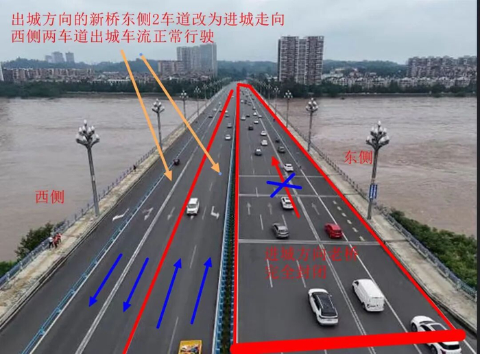 你们好,2025年主城区市政桥梁结构定期检测及养护项目,将对大渡河大桥东幅桥梁(进城方向)进行荷载试验。为确保该项目的顺利推进,试验期间,将对整个东幅桥梁(进城方向)实施封闭管控。封闭时间为2025年12月30日夜间22:00至2025年12月31日早上6:00。届时,出城方向桥梁东侧2车道改为进城走向,西侧2车道改为出城方向正常行驶,请驾驶员遵循现场指挥。