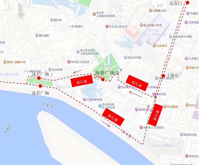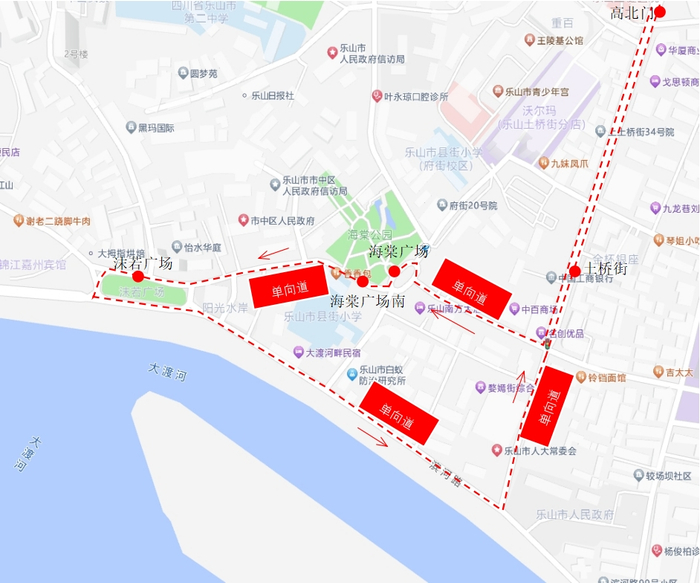 在海棠广场南乘坐1路、2路、14路前往高北门方向的市民请到沫若广场或土桥街公交站乘坐。