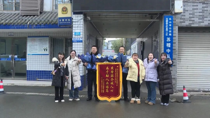 在乐山市公安局交管支队直属二大队苏稽中队,刘女士和朋友向中队民警送上了鲜花和锦旗,锦旗上印有“乐于助人品德高 交警服务暖人心”。