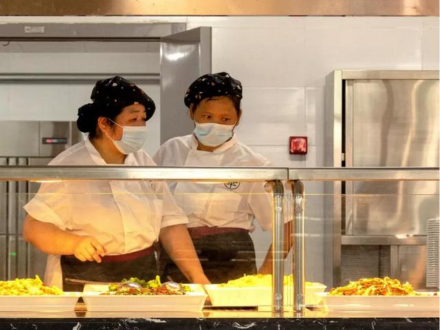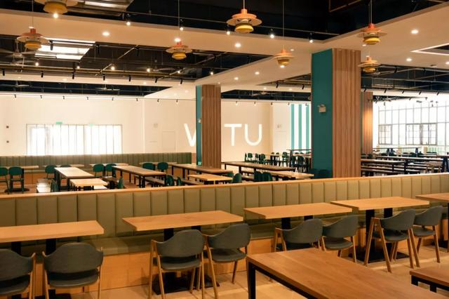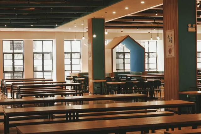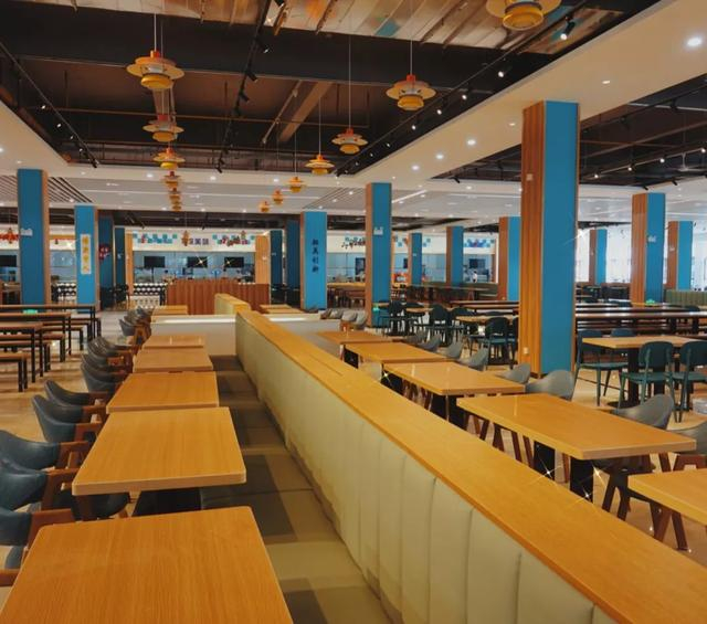 记者在现场看到,新食堂温和的米棕色和浪漫的蓝色系,辅以现代感十足的灯饰与装饰隔断,营造出轻松惬意的就餐氛围。大厅的窗边还增添了吧台式餐桌和高脚凳,一人一餐独自享受美味,可谓是绝佳的体验。