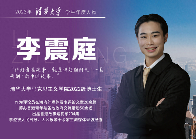 李震庭一直有一个信念:讲好中国故事,让更多人见证“一国两制”下香港发展的新篇章。他是清华大学香港研究生组组长,近年来,曾作为特邀评论员,在香港文汇报、大公文汇融媒体平台、Dotdotnews等境内外媒体上发表有关党的二十大、全面从严治党、粤港澳大湾区发展等中英文评论文章二十余篇;他在香港创办了“讲好香港故事”有限公司,共制作播出204集节目,并联合50余家香港社团举办首届讲好香港故事短视频大赛。除此之外,他还面向领导干部、高校师生等群体开展各类宣讲近十场。